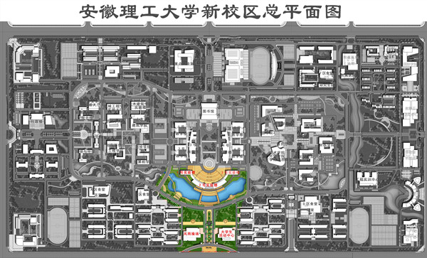 踏入百川门,迎面是一个立着的“安徽理工大学”校徽,校徽颜色为蓝色,蓝色既是科技的象征,也是理性的色彩。校徽上的矿工用的镐既反映了安徽理工大学的历史沿革、发展脉络和特色学科,又象征着安徽理工大学全校师生在新的历史形势下勤恳务实、刻苦奋进的开拓精神;与镐交叉着的是一把钥匙,既寓意打开智慧大门和知识宝库的工具,也代指学习思考的方法论和解决问题的能力。迈上百川大道便真正意义上进入了安理校园。随着百川大道而行,进入一个圆形广场,会蓦然发现一个平铺于场面上的 “安徽理工大学”校徽,这便是“海纳广场”,取“海纳百川,有容乃大”之意。