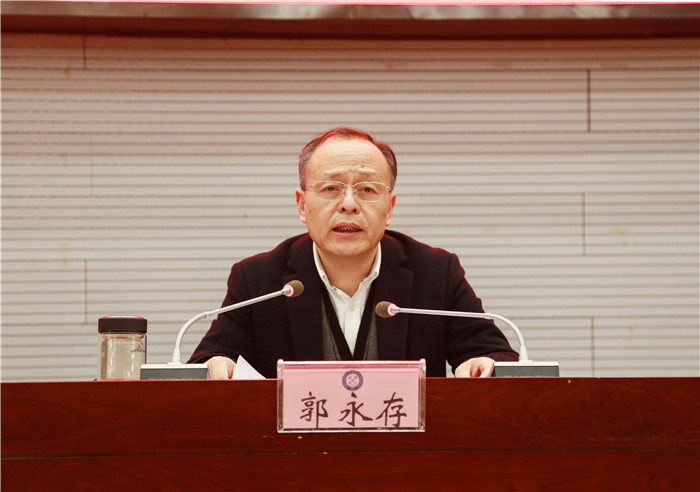 郭永存首先传达了习近平总书记在党史学习教育动员大会上的重要讲话精神,从提高政治站位,把思想统一到习近平总书记重要讲话和重大决策部署上来;把握目标要求,抓实抓细党史学习教育重要任务;加强组织领导,确保党史学习教育取得扎实成效等三个方面,对学校党史学习教育进行了动员部署,提出工作要求。