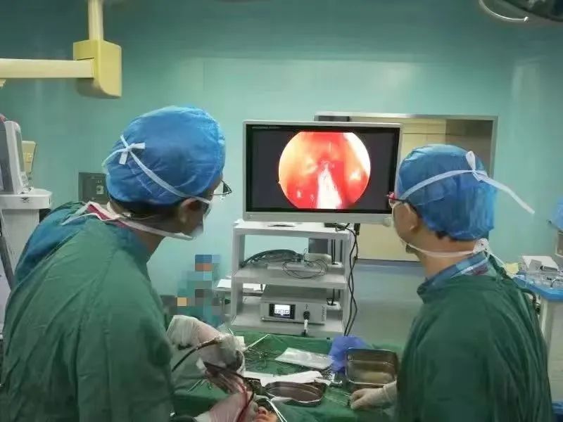 完善术前准备后,由耳鼻喉科副主任医师朱明、眼科谢驰主任、神经外科黄冠敏主任协同合作,在麻醉科控制性降压麻醉监护下进行手术。手术首先在鼻内窥镜下切除钩突,开放并扩大右侧上颌窦自然开口,窦内有大量脓液,予以清除干净,打开筛泡及开放筛、额窦,并扩大额窦口,在充分保护好眼视神经及脑组织前提下,清除所有窦腔内粘液脓性病变并冲洗病变窦腔,待清理干净并充分止血后术腔填入可吸收材料,手术顺利完成。