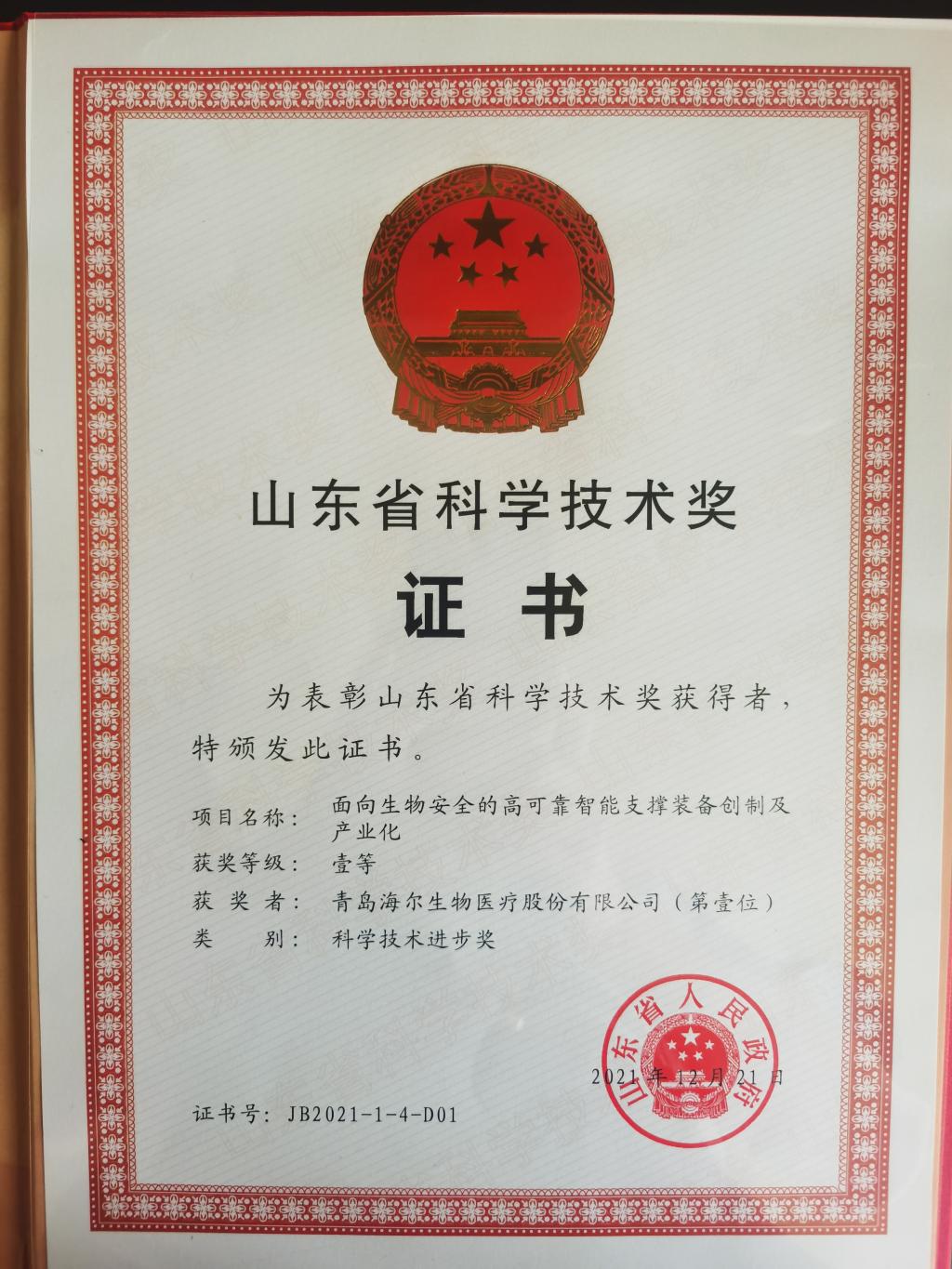 获奖证书(图片来源:海尔生物提供)