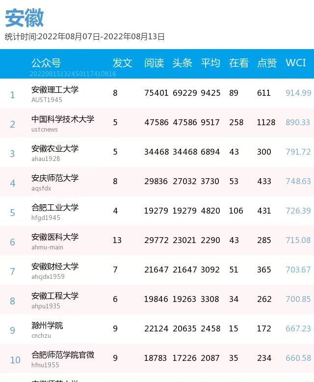 该榜单通过微信公众号推送文章的传播度、覆盖度及公众号的成熟度和影响力,来反映微信整体热度和公众号的发展走势。我校官方微信公众号综合影响力继续入围全国高校百强榜单,排名提升至第57位,位列安徽省内高校首位。