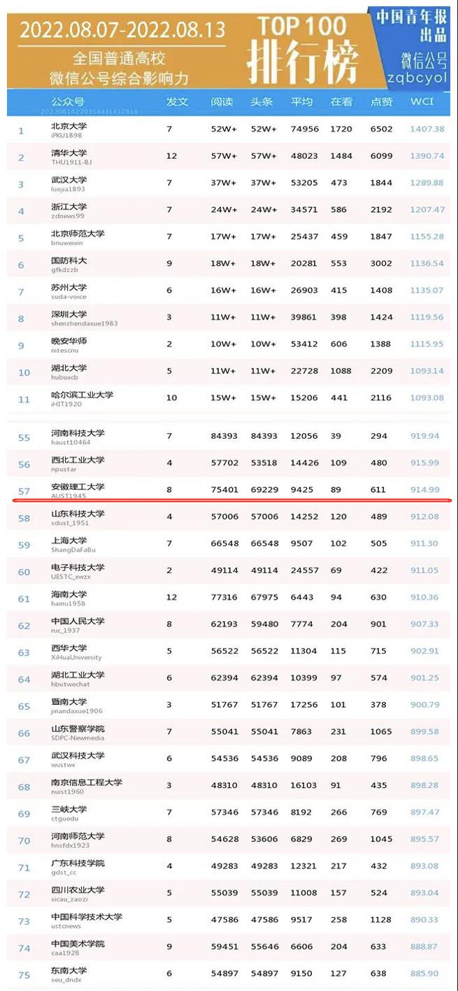 我校官方微信公众号再创佳绩 | 位列全国高校百强第57位
