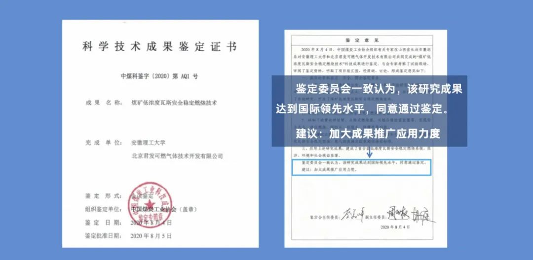 2018年10月,该技术的第一套利用低浓度瓦斯供热工业化装置于在山西省长治市七一煤矿瓦斯发电站建成并投用,2019年12月入选山西省瓦斯综合利用试点示范项目。2020年8月,中国煤炭工业协会组织,由中国工程院蔡美峰院士任主任委员的十一位业内专家组成的专家委员会,对“煤矿低浓度瓦斯安全稳定燃烧技术”进行了鉴定。鉴定委员会一致认为,该研究成果达到国际领先水平,同意通过鉴定,并建议加大成果推广应用力度。