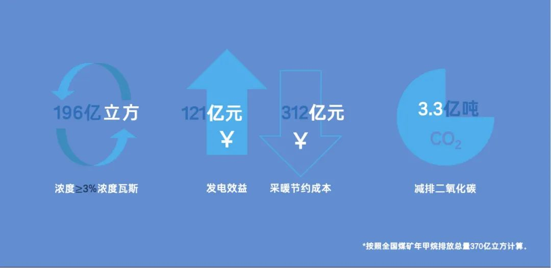 据报道,我国每年在采煤的同时排放的纯瓦斯近370亿立方,其中,浓度≥3%的煤矿瓦斯约占53%,这部分瓦斯如果得到充分的利用,采用热电联供模式:冬季供热,其余季节发电,按照供热量折合天然气价值计算,年供热量折合天然气89亿标准立方米,按照天然气市场价格3.5元/立方计算可节省天然气成本约312亿元,节约标煤1081万吨;年发电量270亿kw·h,按照每度电0.45元计算,年发电产值121亿元,节约标煤809万吨,合计每年创造经济价值433亿元。此外,按照联合国大气污染排放标准(CH₄的温室气体效应是CO₂的26倍)折算,因新技术提高了低浓度瓦斯的利用率,每年可以减少温室气体排放3.3亿吨(折合CO₂量),随着甲烷减排即将纳入碳交易市场,这一项的收入也将计入经济效益当中。
