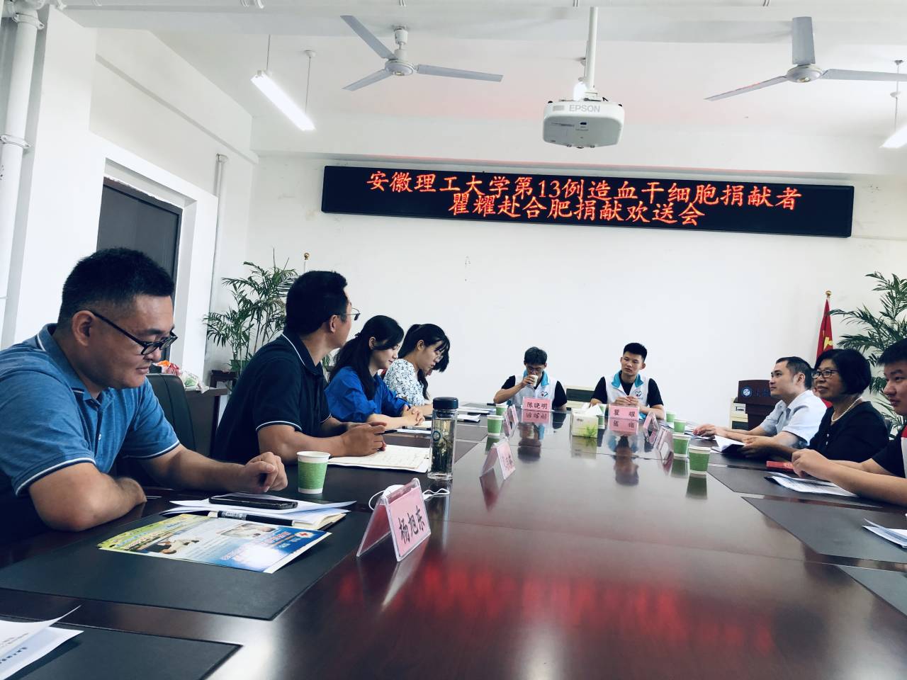 9月5日上午,淮南市红十字会联合安徽理工大学在求是楼南231会议室举行造血干细胞捐献者瞿耀同学赴合肥捐献欢送仪式。淮南市红十字会常务副会长兼秘书长陈玉琴、校团委副书记丁玲玲、土木建筑学院党委副书记张向林、淮南市造血干细胞已捐献者代表及志愿者代表、国寿财险公司负责人等出席欢送仪式。