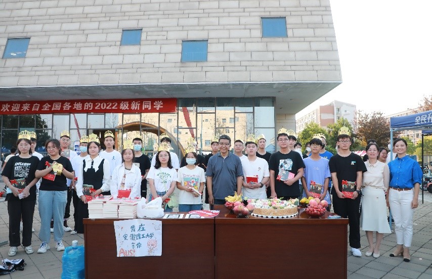 9月11日,安徽理工大学迎来第一批2022级本科新生。当日下午,校团委在迎新现场为9月11日、9月12日出生的新同学举办了一场特别集体生日会。校党委常委、副校长董雨与校团委负责人、各校级学生组织代表共同为20余名2022级新生送上生日祝福。