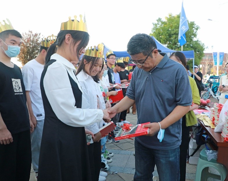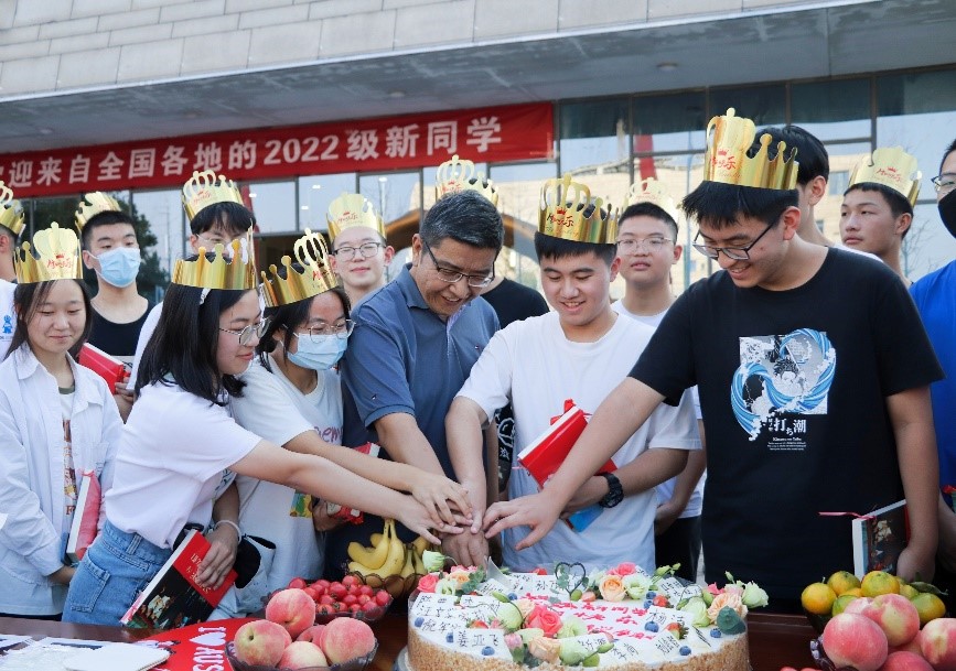 生日会现场,董雨与2022级新生共同唱响生日歌、分享生日蛋糕并合影留念,现场气氛温馨欢乐。他给每位同学赠送了《习近平与大学生朋友们》,希望大家从隆重的仪式感中体会生日的意义,志存高远,勤学善思,努力使自己成长为担当民族复兴大任的时代新人。路过的学长学姐们纷纷为新生唱生日快乐歌,虽是新生报到第一天,却充满了温暖和亲切。