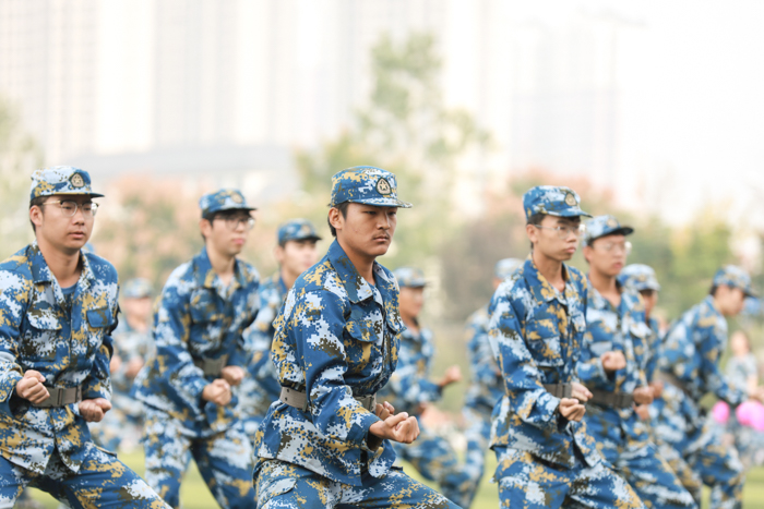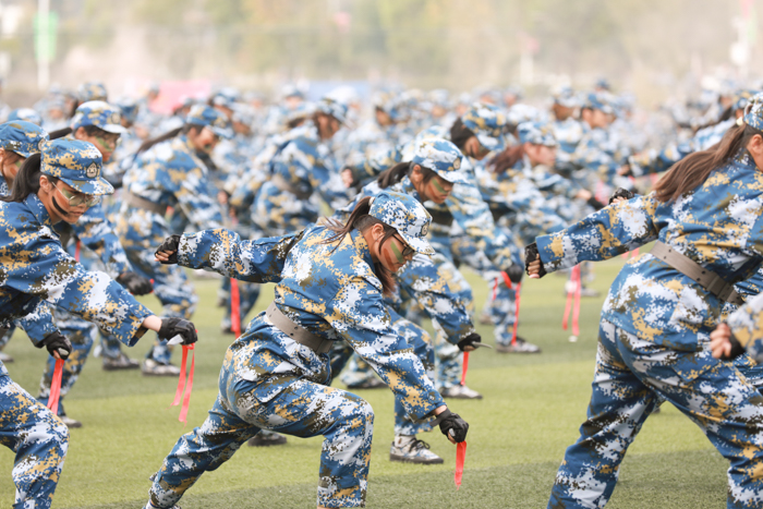 14天军训的磨练,使新生们褪去稚气,增添军人的气魄。瞧!意气风发的他们正阔步向前。伴随着雄壮的阅兵进行曲,在国旗、校旗方队的引领下,由17个学院2022级学生组成的军训团方阵,迈着矫健的步伐,以飒爽的军姿、整齐的队列、饱满的精神依次通过主席台接受检阅,展示了军训刻苦训练取得的骄人成果。随后进行的特色科目汇报表演精彩纷呈,匕首操、格斗术表演刚劲有力,气势如虹;军体拳表演出拳如虎,干净利落;战术动作表演精准出击,一招制敌,尽显军人热血;韵律操表演,活力四射、青春朝气,充分展现了同学们昂扬向上的精神风貌。