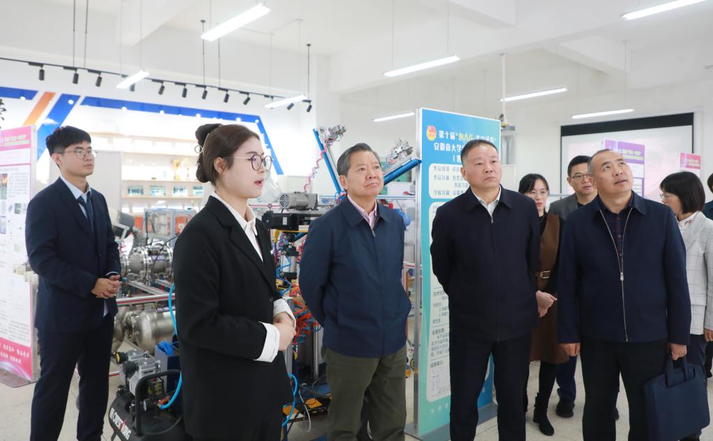 袁亮一行首先来到大学生挑战杯作品展示馆,参观了学校近几年挑战杯获奖作品,听取了正在备战挑战杯竞赛的矿业学院智能采矿21级高润声和其他项目几位同学参赛作品的详细介绍,向同学们致以节日祝贺,并勉励大家劳逸结合,充分肯定了同学们积极参与科技创新,争做科技创新尖兵的担当,预祝同学们在比赛中取得好成绩,展示好安理青年的实力和风采。