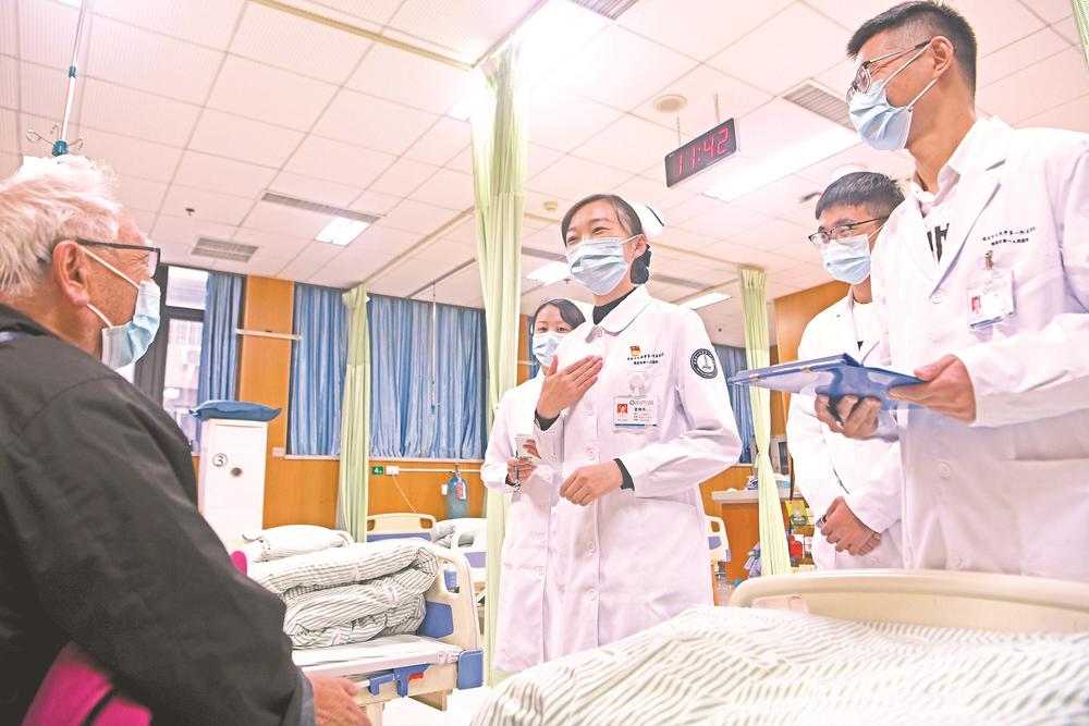 10月26日,党的二十大代表、安徽理工大学第一附属医院(淮南市第一人民医院)日间医疗管理中心副主任、护士长夏晓丹(右三)与患者家属交流。 陈彬 摄