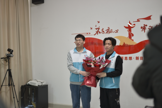 欢送会上,国寿财险公司负责人向许梓强同学捐献志愿者意外伤害保险。已捐献者冯魏交流捐献经历,并为许梓强送上鲜花和祝福。