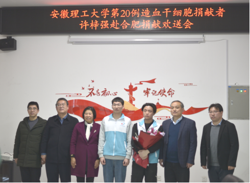 2月27日上午,淮南市红十字会联合安徽理工大学在明道楼A318举行造血干细胞捐献者许梓强同学赴合肥捐献欢送仪式。淮南市红十字会常务副会长陈玉琴、校团委负责人、安徽理工大学第18例捐献者冯魏、志愿者代表、国寿财险公司负责人及力物学院全体领导等出席欢送会。