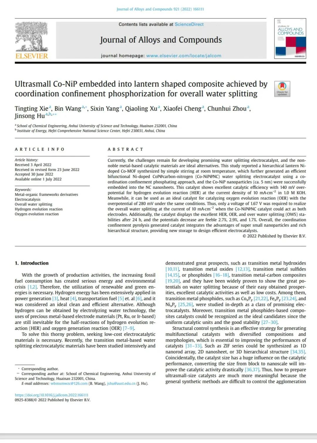 辛勤的馈赠总是丰厚的,今年,她成功根据实验成果连续发表了两篇SCI论文:“ Ultrasmall Co-NiP embedded into lantern shaped composite achieved by coordination confinement phosphorization for overall water splitting”和“Metal-organic framework derived Fe3C nanoparticles coupled single-atomic iron for boosting oxygen reduction reaction”。众所周知,化石燃料消耗的增加造成了严重的能源和环境危机,氢能是一种理想和高效的清洁能源。为了降低电解水的成本,需要对过渡金属基水分类电催化材料进行深入研究。她的第一篇论文研究了一种在室温下通过简单搅拌合成的分层灯笼状掺Ni Co-MOF,使用共配约束磷化法进一步产生了高效的双功能掺Ni CoP@NC全分解水电催化剂;高效且环保的能源转换和储存系统,如金属空气电池和燃料电池,已成为研究热点,开发和探索高效的非贵金属电催化剂至关重要。第二篇论文研究了通过配位热解效应成功构建的Zn/Fe-金属-有机框架衍生的Fe3C耦合FeNx催化剂。