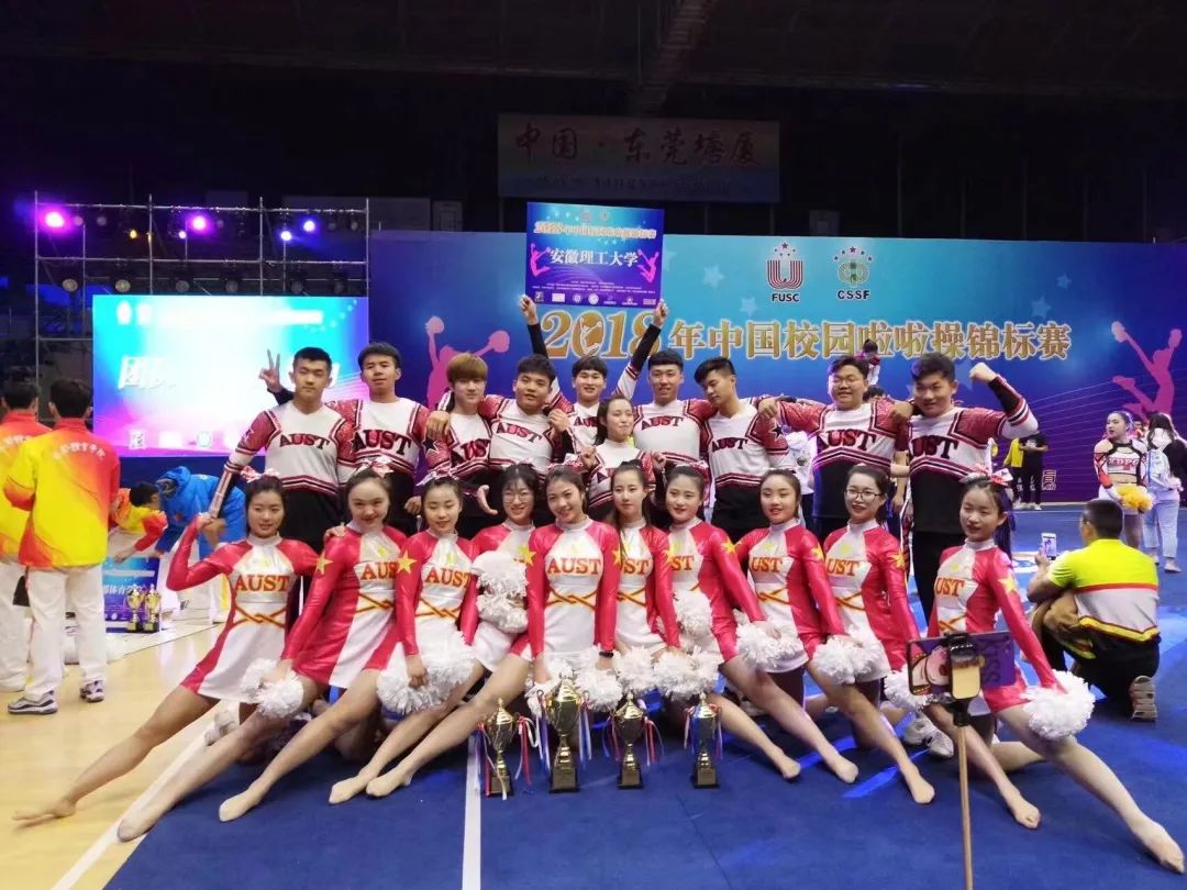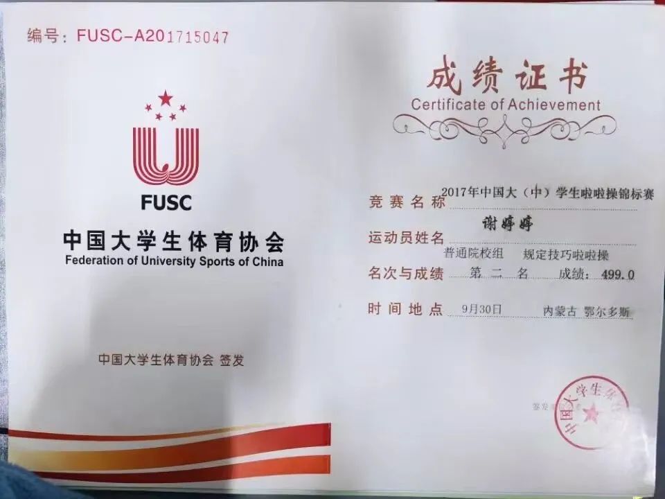 另一场比赛是2018年中国校园啦啦操锦标赛,这次比赛难度相较于第一次比赛上升了很多,而且团队报的项目较多,每个人需要参加两三项,任务比较重。这却没有影响到他们的心态,“我们训练时其实很放松,并不是特别紧张。”谢婷婷说。那次集训在八月份,正值暑假,学校发了西瓜,训练空隙,他们就在风雨操场训练馆中分着吃,与同伴谈笑着,在紧锣密鼓的训练里也品出了一分惬意。可意外总是那么巧,在这一次比赛前,谢婷婷的手臂在训练时不慎轻微扭伤,这是她第一次训练时受伤,她没有自乱阵脚,冷静处理后坚持正常参加比赛,令她开心的是扭伤并没有影响到此次表演,这次比赛中他们也取得了公开青年丙组集体技巧高级(3-4级)自选动作混合第一名、集体花球自选动作第二名的好成绩。
