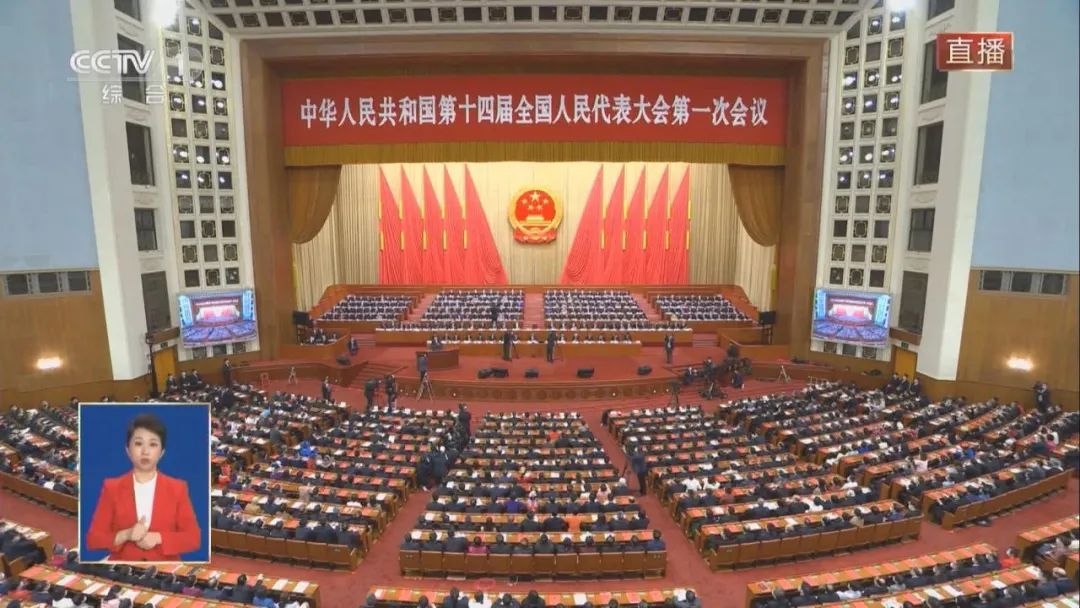 在圆满完成各项议程后,十四届全国人大一次会议在激昂的国歌声中胜利闭幕。