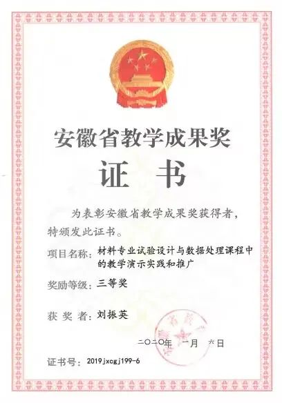 除了在科研领域,刘振英作为系副主任、教研系主任,还承担起了课程建设和改革的事宜。她通过增加实践教学学分比例,以此完善实践教学体系。以室内实验教学为主导,以校外实践教育基地为基础,不断推进专业校外实践基地建设。注重产、学、研结合,实现了校企人才培养的无缝对接。多元化实践教学也提升了学生创新意识和工程实践创新能力。因此,她对于“双碳”战略背景下无机非金属材料工程专业教学综合改革与创新,也荣获安徽省教学成果奖三等奖。