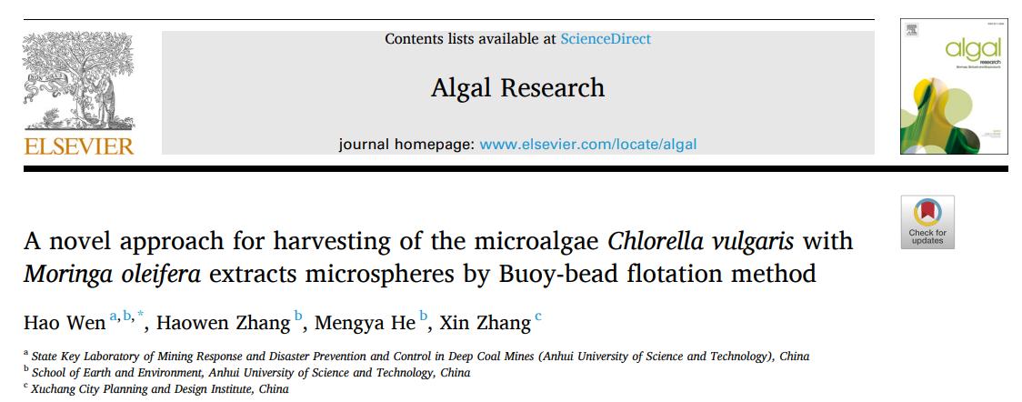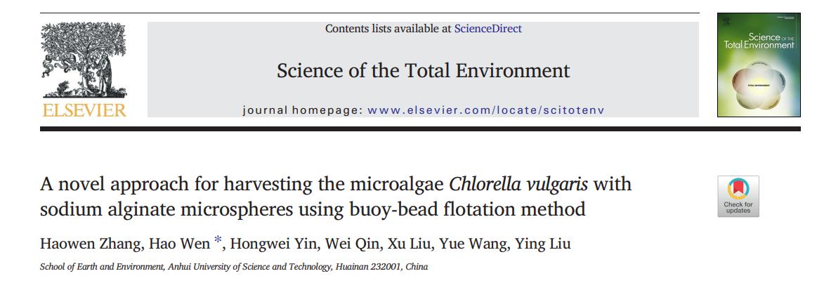 近日,地球与环境学院教师文豪博士在环境领域权威期刊《Science of the Total Environment》(中科院一区TOP期刊,2022年影响因子10.753)发表题为“A novel approach for harvesting the microalgaeChlorella vulgariswith sodium alginate microspheres using buoy-bead flotation method”的论文。安徽理工大学为论文的第一完成单位和通讯单位,地球与环境学院硕士研究生章浩文同学为论文的第一作者,文豪博士为论文的通讯作者。
