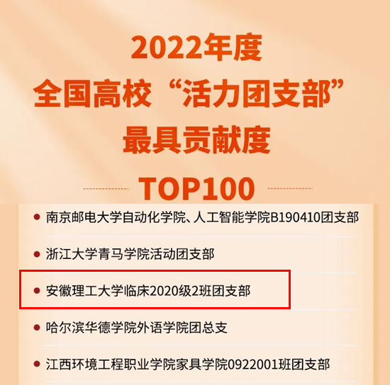 近日,由团中央基层建设部指导,中国青年报社开展的2022年度高校“活力团支部”风采展示活动结果公布,经过校内选拔、校级展示、省级展示、全国展示等环节,我校医学院2020级临床医学专业2班团支部成功上榜全国高校“活力团支部”最具贡献度TOP100榜。