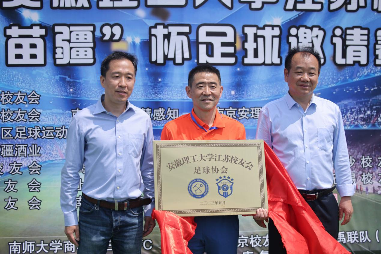 江苏校友会会长贾政和、南京市建邺区足球运动协会主席单杰共同为安徽理工大学江苏校友会足球协会揭牌