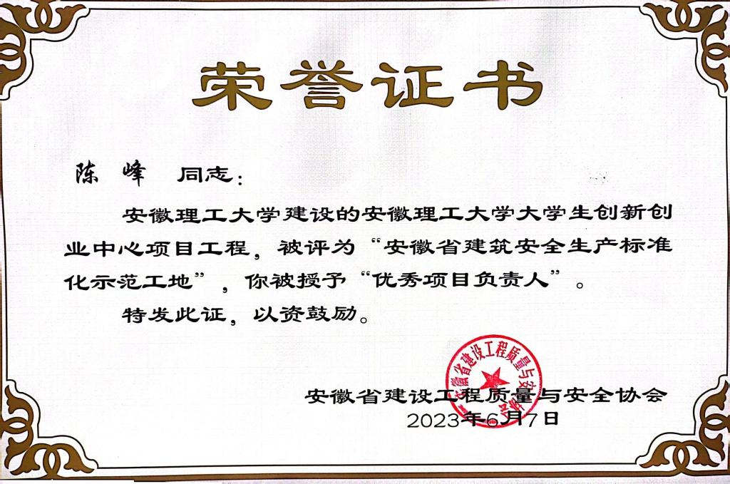 近日,继研究生公寓3号楼项目、医教研协同与职业安全健康创新中心项目获奖后,大学生创新创业中心项目再次获评“安徽省建筑安全生产标准化示范工地”;陈峰获评“优秀项目负责人”。