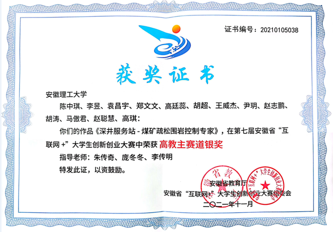 陈中琪大学期间主持国家级大创项目,撰写申请专利,参加学科竞赛,制作实物展示模型,每一项工作都要尽自己所能做到最好。开始撰写申请专利时,因经验和技能不足,多次被驳回申请,这项他从未接触且具有巨大挑战的工作,让他沮丧过,但这并没能打退他挑战自己的决心,在学院老师的帮助和他自己的努力下,陈中琪大一便授权国家专利证书,之后更是授权国际发明专利证书。“前不久的“挑战杯”安徽省决赛杯赛期间,面对其作品实物模型功能展示不完善问题,他有时候会和团队成员一直安装调试设备模型到深夜3-4点,连续坚持了近一个星期,作品最终拿到了金奖。陈中琪就是这样一个不惧失败、不畏困难、不怕吃苦、敢于挑战的学生,作为项目的指导老师(他口中的冬哥),被他的那份坚定毅力所折服。”庞冬冬老师对陈中琪这样评价到。