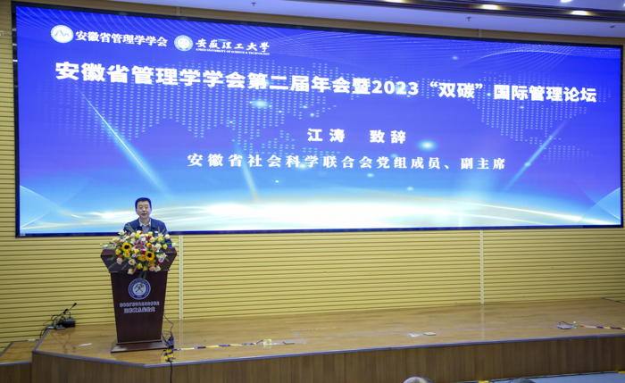 江涛代表安徽省社会科学界联合会对年会的成功举办表示祝贺。他表示“双碳”的提出是中国式现代化独特的生态观的重要体现。目前安徽省主要任务是谋定“三地一区”战略定位和“七个强省”建设。作为安徽省管理学界一年一度的盛事和学术交流的重要平台,希望本次大会秉承严谨的学术精神,立足安徽实际,多学习交流,碰撞互鉴,直面问题难题,紧扣时代发展脉搏,为安徽省经济社会高质量发展精准把脉。