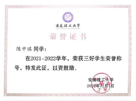 良好的学习习惯让陈中琪顺利考取安徽理工大学。在矿业工程学院,他勤奋学习,成绩一直位列班级前十,曾经有人建议陈中琪转专业到所谓的热门专业,但他并没有这样做,而是继续学好自己的专业,千方百计地提升自己的水平。而后来的事实证明,陈中琪的选择是对的。“一定要有自己的想法,不能轻易地就被别人带着跑,要学会倾听自己内心的声音,我就是想在我自己的专业领域里争取做到最好,而不是去盲目跟风转专业,而且我相信我可以做好。”陈中琪告诉笔者。