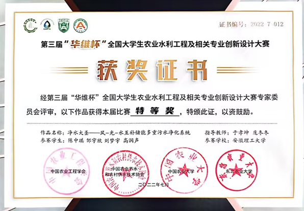 陈中琪大学期间主持国家级大创项目,撰写申请专利,参加学科竞赛,制作实物展示模型,每一项工作都要尽自己所能做到最好。开始撰写申请专利时,因经验和技能不足,多次被驳回申请,这项他从未接触且具有巨大挑战的工作,让他沮丧过,但这并没能打退他挑战自己的决心,在学院老师的帮助和他自己的努力下,陈中琪大一便授权国家专利证书,之后更是授权国际发明专利证书。“前不久的“挑战杯”安徽省决赛杯赛期间,面对其作品实物模型功能展示不完善问题,他有时候会和团队成员一直安装调试设备模型到深夜3-4点,连续坚持了近一个星期,作品最终拿到了金奖。陈中琪就是这样一个不惧失败、不畏困难、不怕吃苦、敢于挑战的学生,作为项目的指导老师(他口中的冬哥),被他的那份坚定毅力所折服。”庞冬冬老师对陈中琪这样评价到。