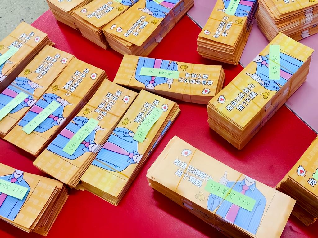 各学院也为考研学子精心准备了形式多样的“冲刺大餐”:开展考研誓师大会、鼓舞考研学生士气;举办应试技巧辅导,增强考研信心;定制考研签名墙,为自己和他人加油打气!在印有“金榜题名”和“未来可期”的考研加油包里,有考研必备的文具用品、寓意“士气满满”的士力架、“身体健康”的牛奶、“心想事成”的橙子、“考研上岸”的挂坠以及零食点心,有些“加油包”中还有辅导员、学弟学妹的手写祝福卡,让正在冷冬中紧张备考的考研学子们真切感受到来自学院的爱与温暖。