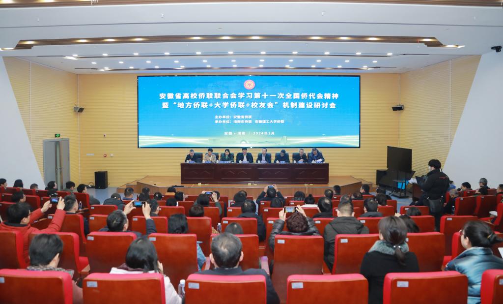 1月11日,由安徽省侨联主办,淮南市侨联、安徽理工大学侨联共同承办的安徽省高校侨联联合会学习第十一次全国侨代会精神暨“地方侨联+大学侨联+校友会”机制建设研讨会在我校国家重点实验室学术报告厅隆重举行。省侨联党组书记、主席李世蕴,中国侨联基层建设部二级巡视员蔡红雷,淮南市委常委、市委统战部部长张劲松,校党委常委、副校长董雨,省侨联党组成员、秘书长刘君,省委教育工委组干处副处长、二级调研员王树龙,淮南市政府副秘书长、市侨联主席杨倩,中国科学技术大学侨联主席、安徽省高校侨联联合会会长单位负责人汪箭,安徽理工大学侨联主席、安徽省高校侨联联合会秘书长单位负责人李广学等出席会议。会议由刘君主持。各市侨联、高校侨联负责人,淮南市侨界群众,各级侨联组织代表参加会议。