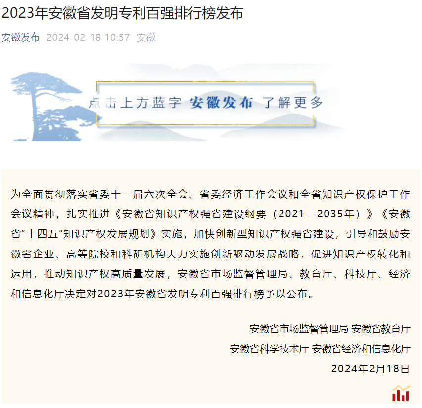 我校在2023年安徽省发明专利百强排行榜中再上新位次