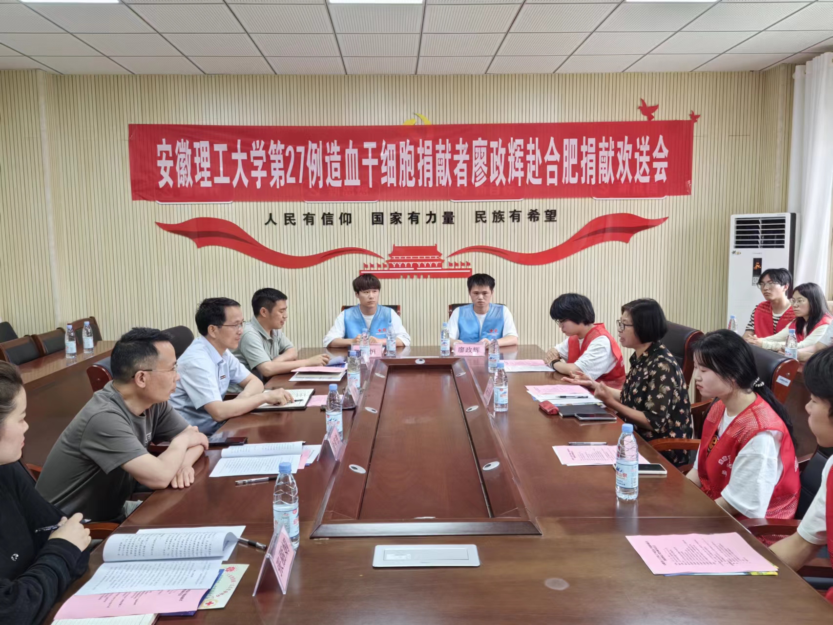 5月21日下午,安全科学与工程学院在宁远楼A306会议室举行造血干细胞捐献者廖政辉同学赴合肥捐献欢送仪式。淮南市红十字会常务副会长兼秘书长陈玉琴,安全科学与工程学院、学生处、校团委等负责人,学院辅导员、淮南市造血干细胞已捐献者代表、志愿者代表、班级学生代表、国寿财险公司负责人出席欢送仪式。