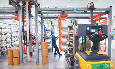 重庆市黔江区工业园区近年积极推动实体经济与人工智能、大数据、互联网技术深度融合,推动传统产业数字化、智能化转型。图为该园区某企业工人在智能化流水线上处理机器人转运的玻纤产品。