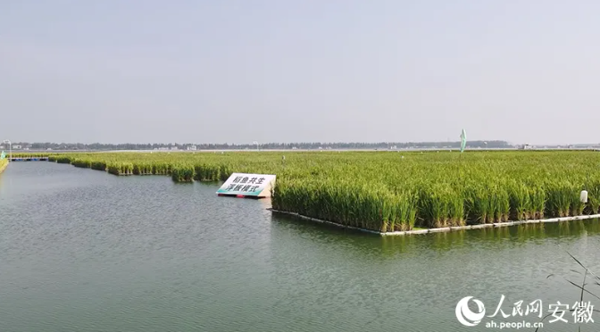 走进淮南市凤台县顾桥镇,永幸河旁采煤沉陷区水域的“丰”景让人眼前一亮:一株株水稻乘着浮板整齐地漂在水上,稻穗日渐饱满成熟、长势良好,不同品种、不同颜色的水稻交映成趣。