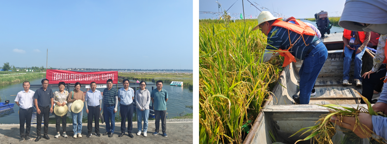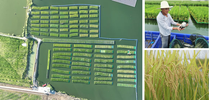 创新成果1:采用稻鱼共生浮板、纳米膜和浮筒三种种植模式,以浮筒为田埂,浮板为田块;以浮板为种植平台,台上种稻,台下养鱼,创新构建了兼顾稳定性以及多功能性的广域沉陷水面立体种养格局。