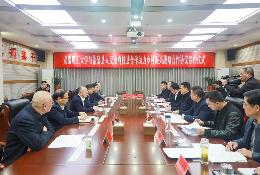 签约仪式上,郭永存发表了热情洋溢的讲话。他指出,在深入学习贯彻习近平总书记考察安徽重要讲话精神,全面推动落实党的二十届三中全会精神的关键时刻,安徽理工大学与临泉县签订助力乡村振兴战略合作协议,是贯彻落实省委、省政府“百校联百县兴千村”行动要求的切实举措,是着力推进脱贫攻坚与乡村振兴有机衔接的有力行动。一直以来,学校充分发挥特色优势,结合临泉发展所需,坚持把定点帮扶工作作为重大政治任务扛在肩上、摆在突出位置,始终带着深情厚谊开展教育、科技、健康、消费和美好乡村建设等帮扶,先后选派了2批次6名驻村帮扶干部,接续帮扶临泉县滑集镇王香铺村和杨小村,为胜利完成脱贫攻坚任务做出了应有贡献,校县双方建立了深厚的友谊,打下了良好的合作基础。他期待校县双方按照着力构建城乡融合发展新格局,全面推进乡村振兴的总体要求,结合实际突出重点,充分发挥学校智力资源优势,开展人才联合培养、专业培训,助力区域教育、医疗等事业发展;充分发挥学校在智能制造、机电研发推广等学科优势,助力区域新兴产业发展;充分发挥学校在思政学科领域的优势,助力区域红色文化和传统文化资源挖掘,探索乡村振兴与思政育人双向赋能、协同发展有效路径,推动文化和旅游融合发展;积极探索校县党组织结对共建机制,努力形成“资源共享、活动联办、优势互补、共同发展”的良好格局,着力推动既定事项落地落实、开花结果,全力打造校县合作共赢新时代典范。