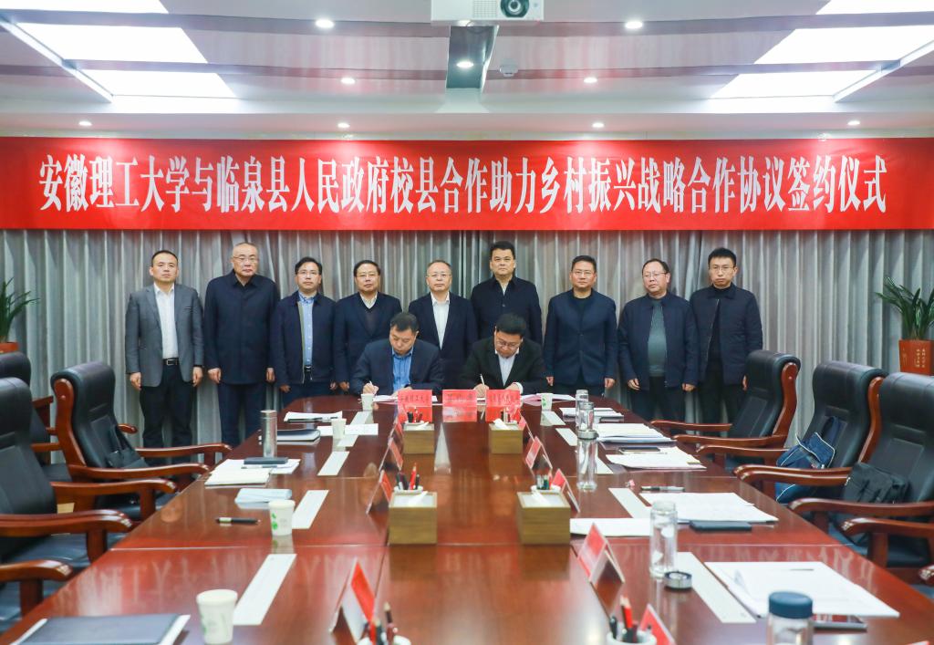 11月19日,校党委书记郭永存带队赴临泉县调研并签订校县合作助力乡村振兴战略协议,受到临泉县委书记江利国热情接待。校党委常委、副校长鲁超,临泉县委常委、县政府副县长汪涛,临泉县副县长、县政府办主任杨亚军出席签约活动。