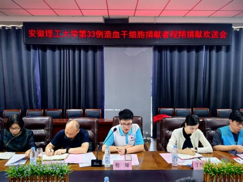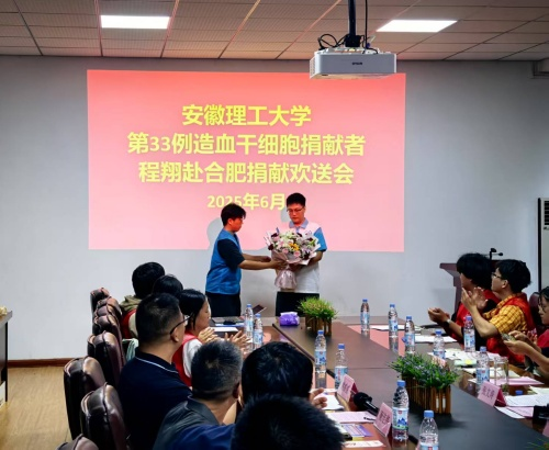 6月18日,电气与信息工程学院2025届毕业生程翔造血干细胞捐献欢送会在电气与信息工程学院B407(+)会议室举行。淮南市红十字会常务副会长兼秘书长陈玉琴,校团委、学生处、学院有关负责人,校第23例捐献者赵智伟及志愿者代表等参加欢送仪式。