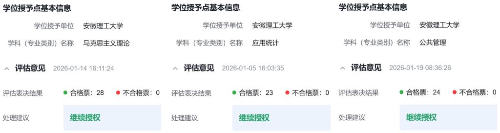 近日,国务院学位委员会学科评议组和全国专业学位研究生教育指导委员会陆续反馈我校2025年学位授予点专项合格评估结果。学校马克思主义理论一级学科硕士点以及应用统计、公共管理硕士专业学位点均以全票通过专项合格评估,顺利获得继续授权资格。