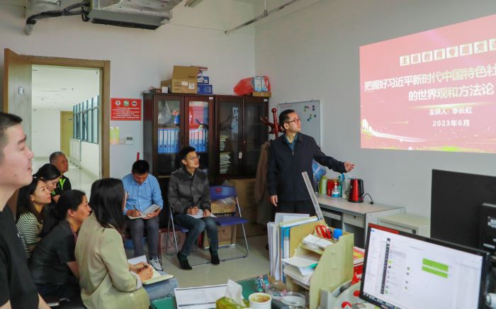 6月5日上午,党委宣传部统战部党支部在舜耕楼1023办公室开展学习贯彻习近平新时代中国特色社会主义思想主题教育专题学习,由党委宣传部副部长李长虹为大家讲授《把握好习近平新时代中国特色社会主义思想的世界观和方法论》,党委宣传部、党委统战部副部长董坤主持学习活动。